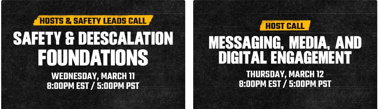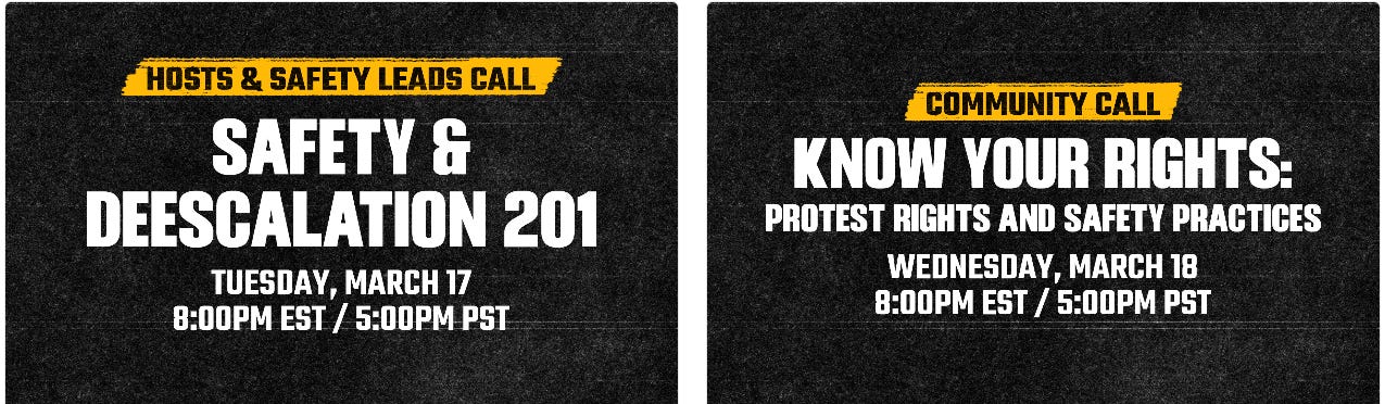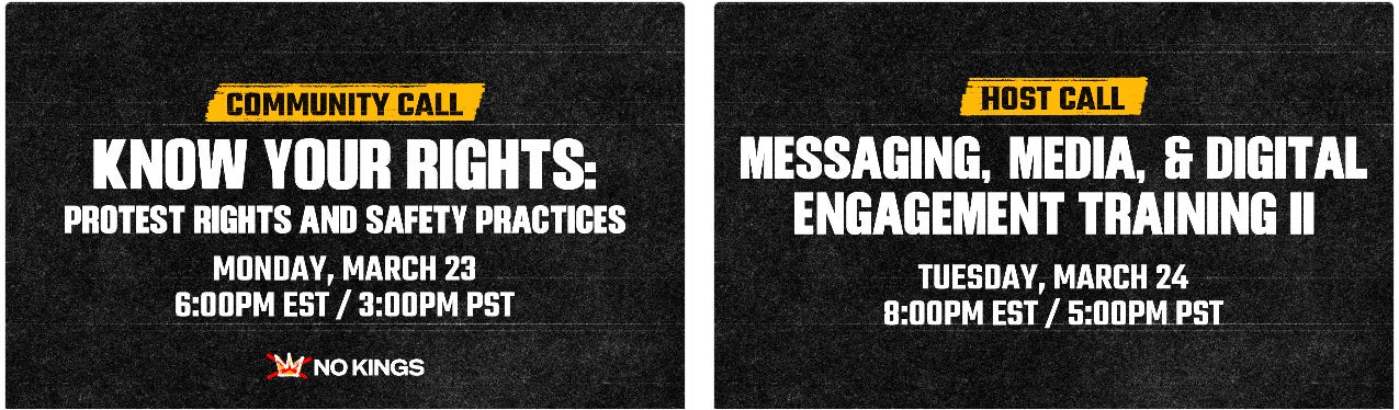 If you are an event host, safety lead, or local organizer: The coalition is running a separate track of trainings for you including sessions on de-escalation, safety planning, media and messaging, and movement building (the March 16 session is brought to you by No Kings in partnership with 50501). Visit nokings.org/trainings for the full schedule and RSVP links. Some of these sessions may be limited to registered hosts, so check the details before signing up.