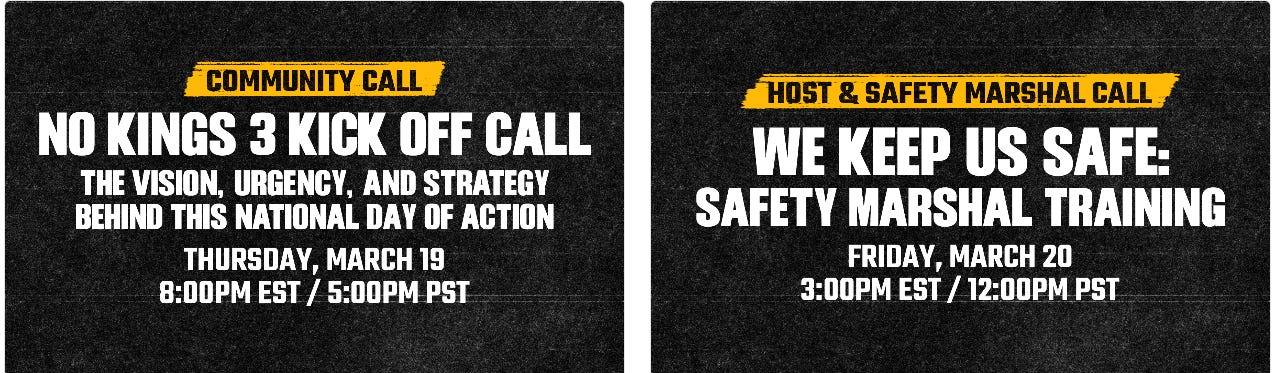 March 19 | No Kings 3 kickoff call with movement leaders on the vision, urgency, and strategy behind March 28. Whether you are brand new or a seasoned organizer, this one is for you. (8:00 PM ET)