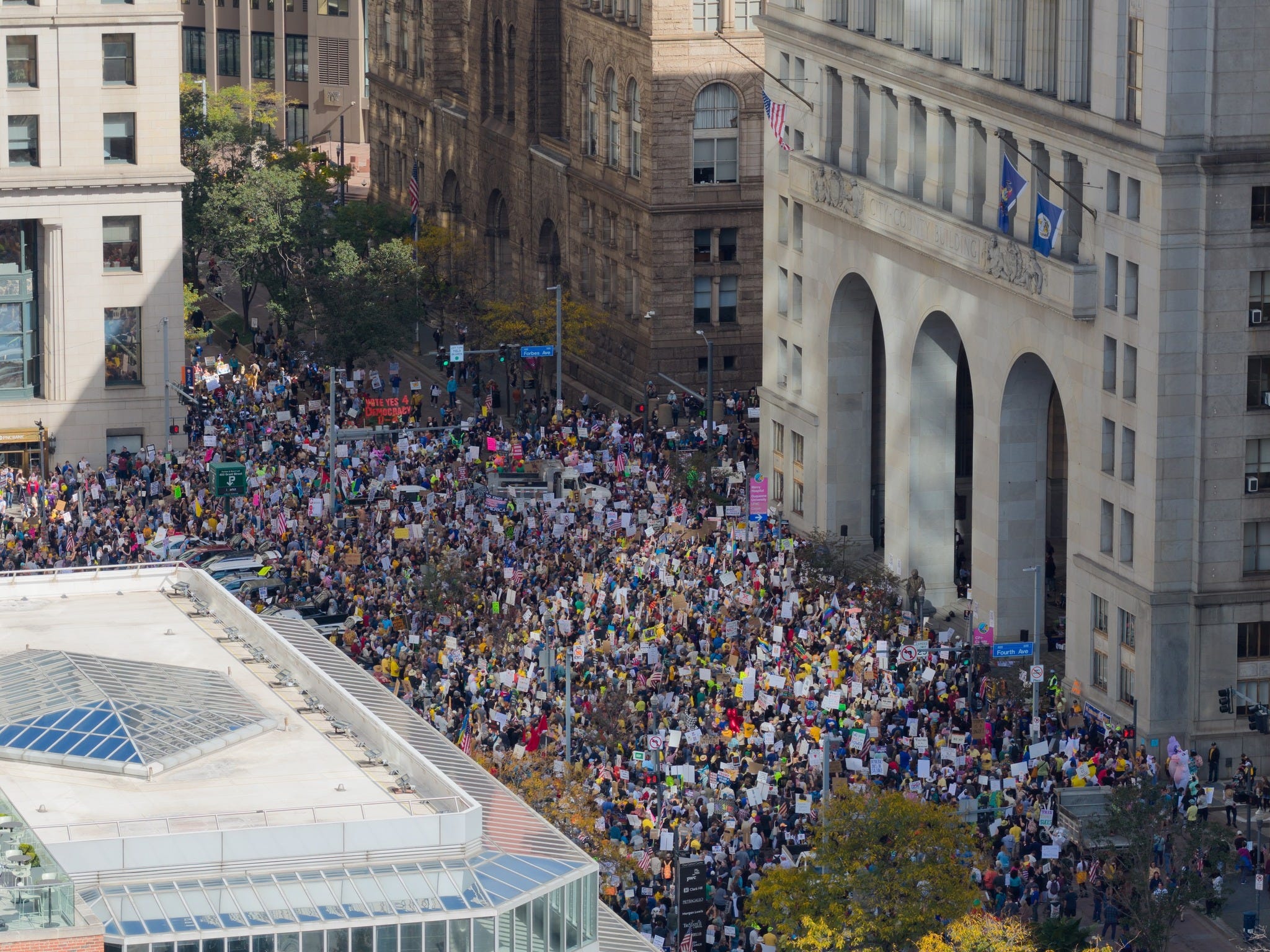 City officials estimated that more than 15,000 people flooded downtown Pittsburgh, with additional demonstrations across the city.