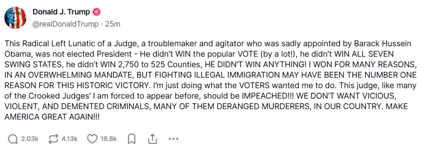 After a court blocked his attempt to revive an 18th-century sedition law to justify mass deportations, Trump attacked U.S. District Judge James Boasberg personally on Truth Social and floated impeachment, rather than arguing with the ruling. Legal reporting in Reuters and Lawfare noted how unprecedented this was for a sitting president.