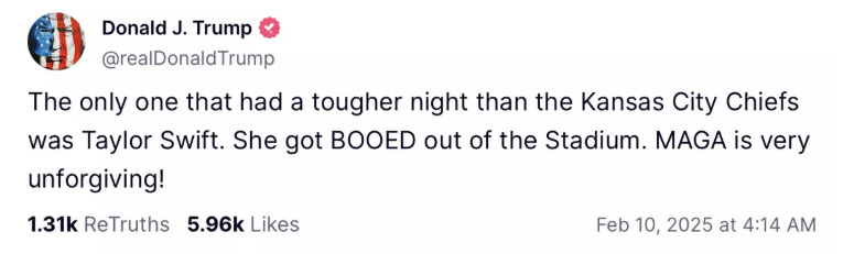 Super Bowl Sundayâ After Eagles fans booed Taylor Swift on the jumbotron, Trump posted that âthe only one who had a tougher night than the Chiefs was Taylor Swift,â claiming she âgot BOOED out of the Stadium. MAGA is very unforgiving!â