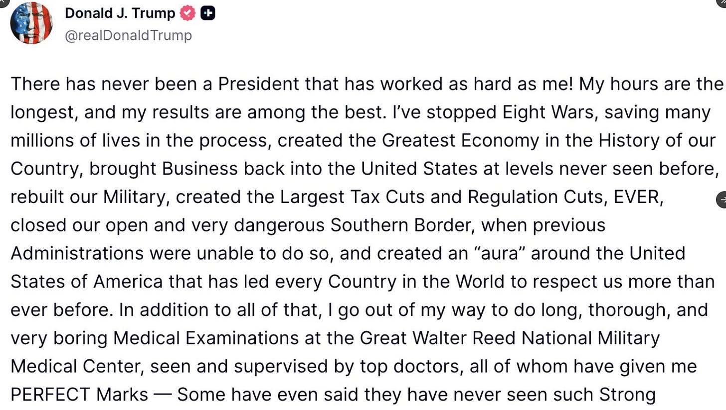 Axios (via X)â âTrump made 158 posts from 9pm Monday to 12am Tuesdayâ X (formerly Twitter)Health rant â âseditious, perhaps even treasonousâ to question him