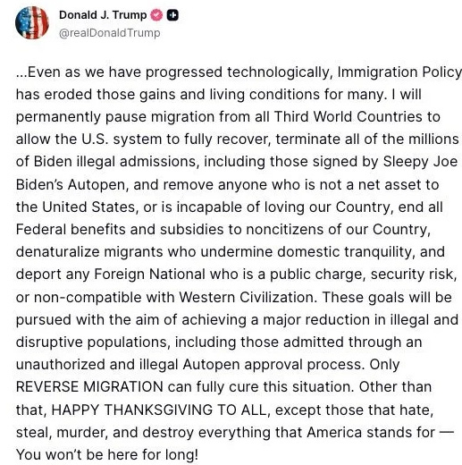 NBC Washingtonâ âTrump vows to âpermanently pauseâ migration from poor nations in anti-immigrant screedâ NBC4 WashingtonLate-night Truth Social posting spree (150+ posts)