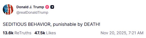 Reutersâ âTrump says Democrats who told troops to refuse illegal orders deserve deathâ Reuters