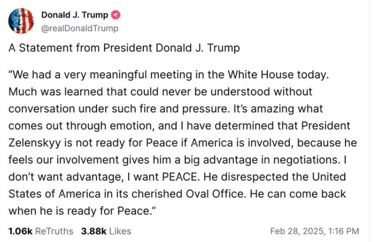 February 28 â After a contentious Oval Office meeting where Trump and Vance berated Ukraineâs President Volodymyr Zelensky for being insufficiently grateful, Trump posted that Zelensky âis not ready for Peaceâ and âdisrespected the United States of America in its cherished Oval Office.â He then canceled their joint press conference and cut the visit short, as reported by multiple outlets including CNN and BBC.