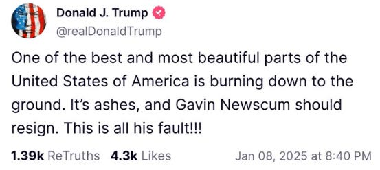 Late Januaryâ As devastating wildfires hit California, burning communities and forcing evacuations, Trump used Truth Social to attack Californiaâs Democratic leadership, including calling Governor Gavin Newsom âNewscumâ and suggesting he should resign instead of focusing on federal assistance, according to national and California press coverage at the time.