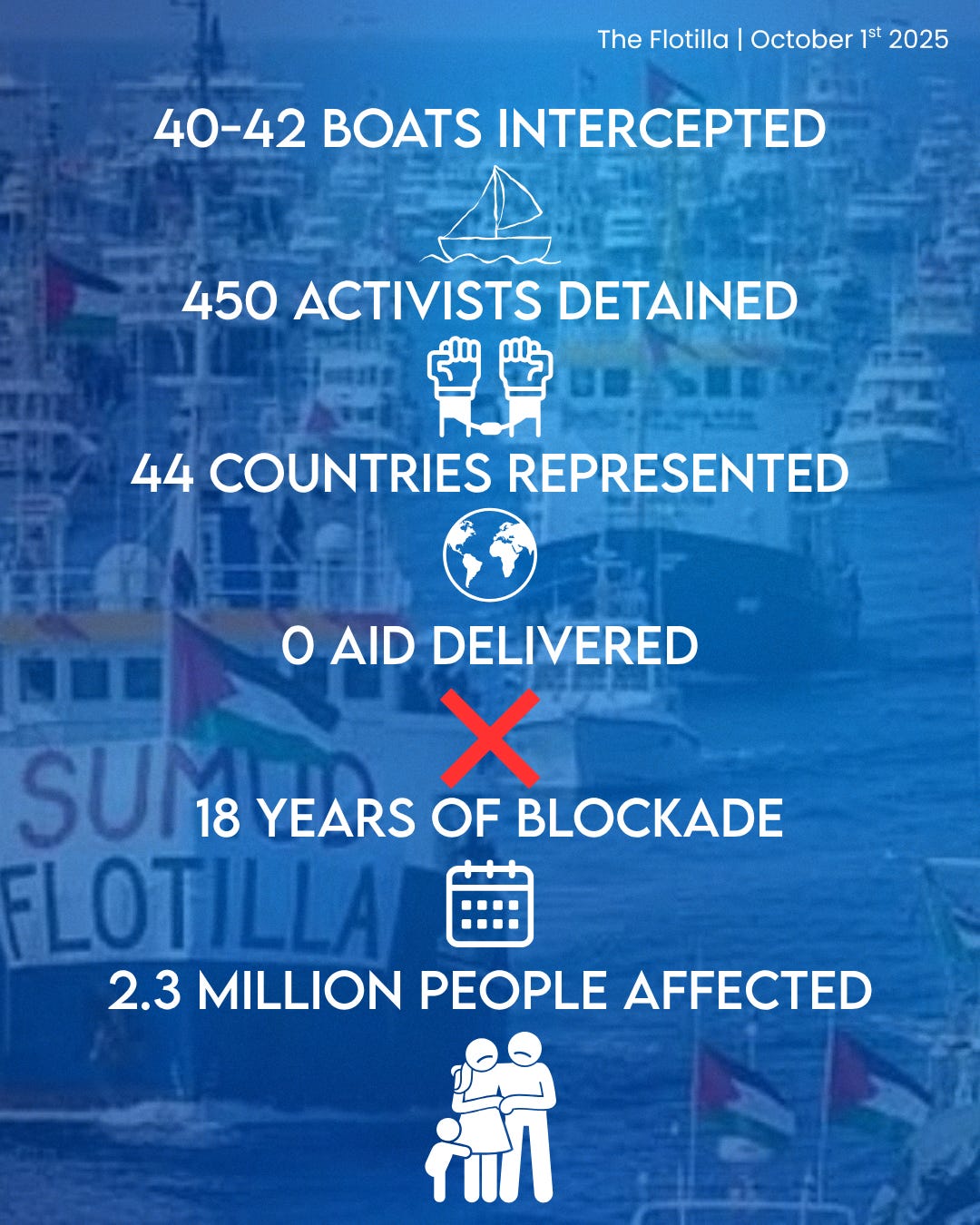 📊 Zero aid delivered despite roughly 450 activists from 44 countries attempting to help 2.3 million people under blockade.
