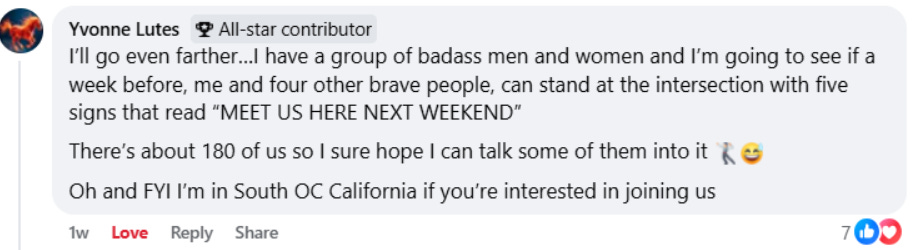 Yvonne has a group of about 180 people in South OC, planning to put five of them at an intersection the week before No Kings 3 (March 28th!) This is creative, strategic, and a visible, repeated, community-level message that something is happening here and it involves your community.