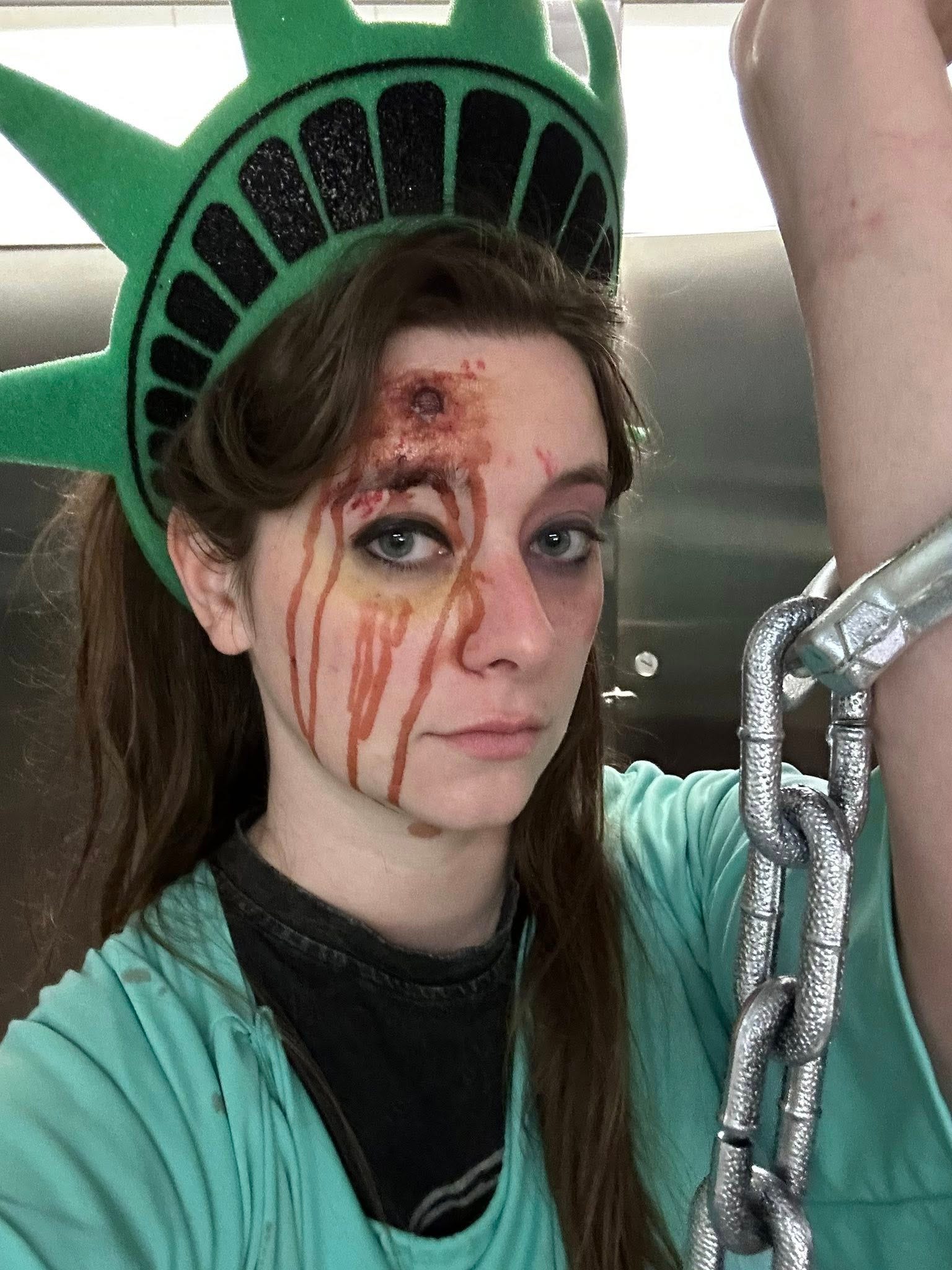 Brittany posted in The 50501 group and described herself as someone who had never been involved in politics before and now she’s showing up to local city council meetings with a growing group of community members. And she’s making a statement with her wardrobe while at it! Dressed as the Statue of Liberty in distress… bruised, bloodied, but still standing. Brittany turned her presence into something no one in that room could look away from. “We keep showing up,” she wrote, “and the crowd gets bigger and bigger. We realize we are not alone.”