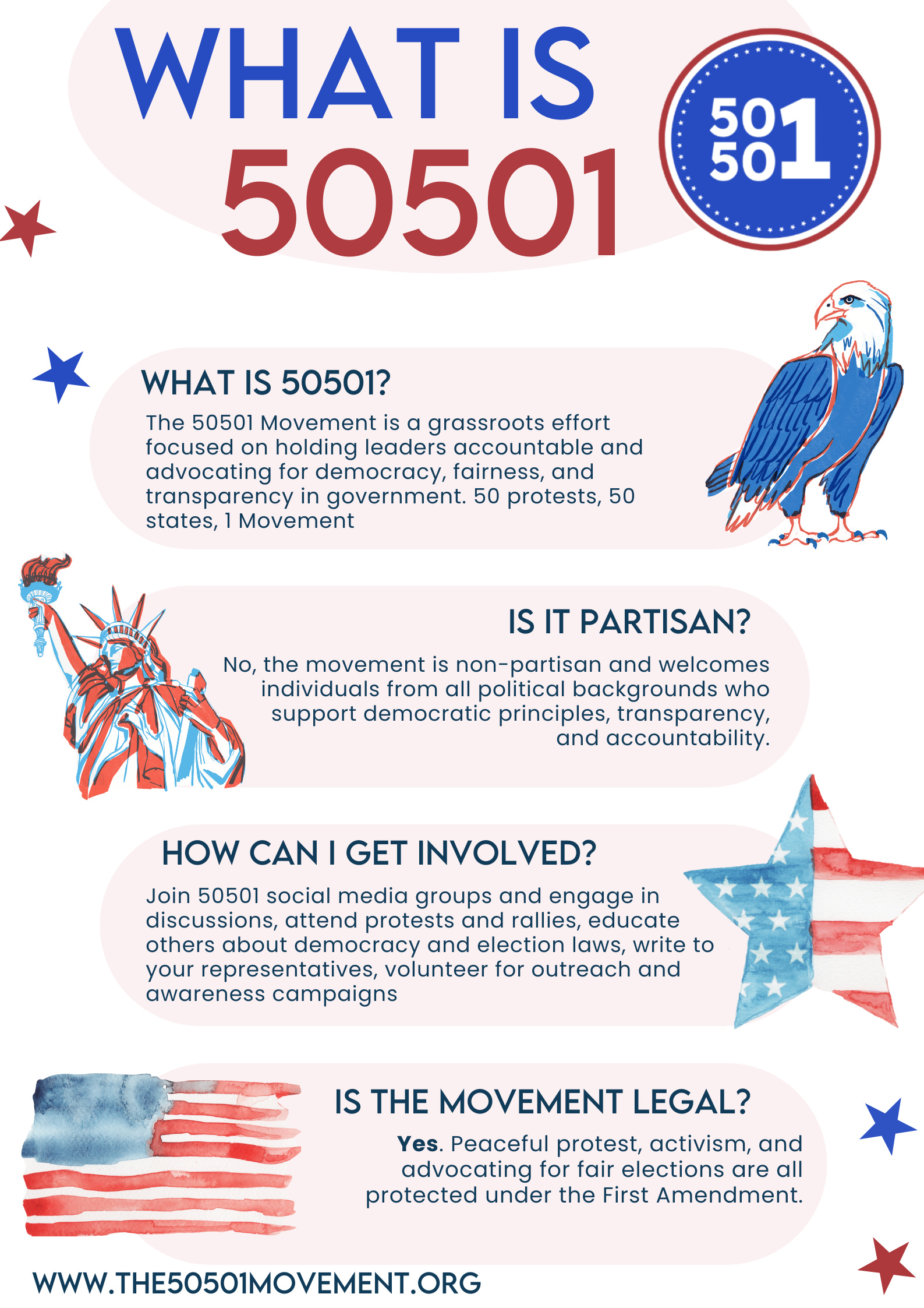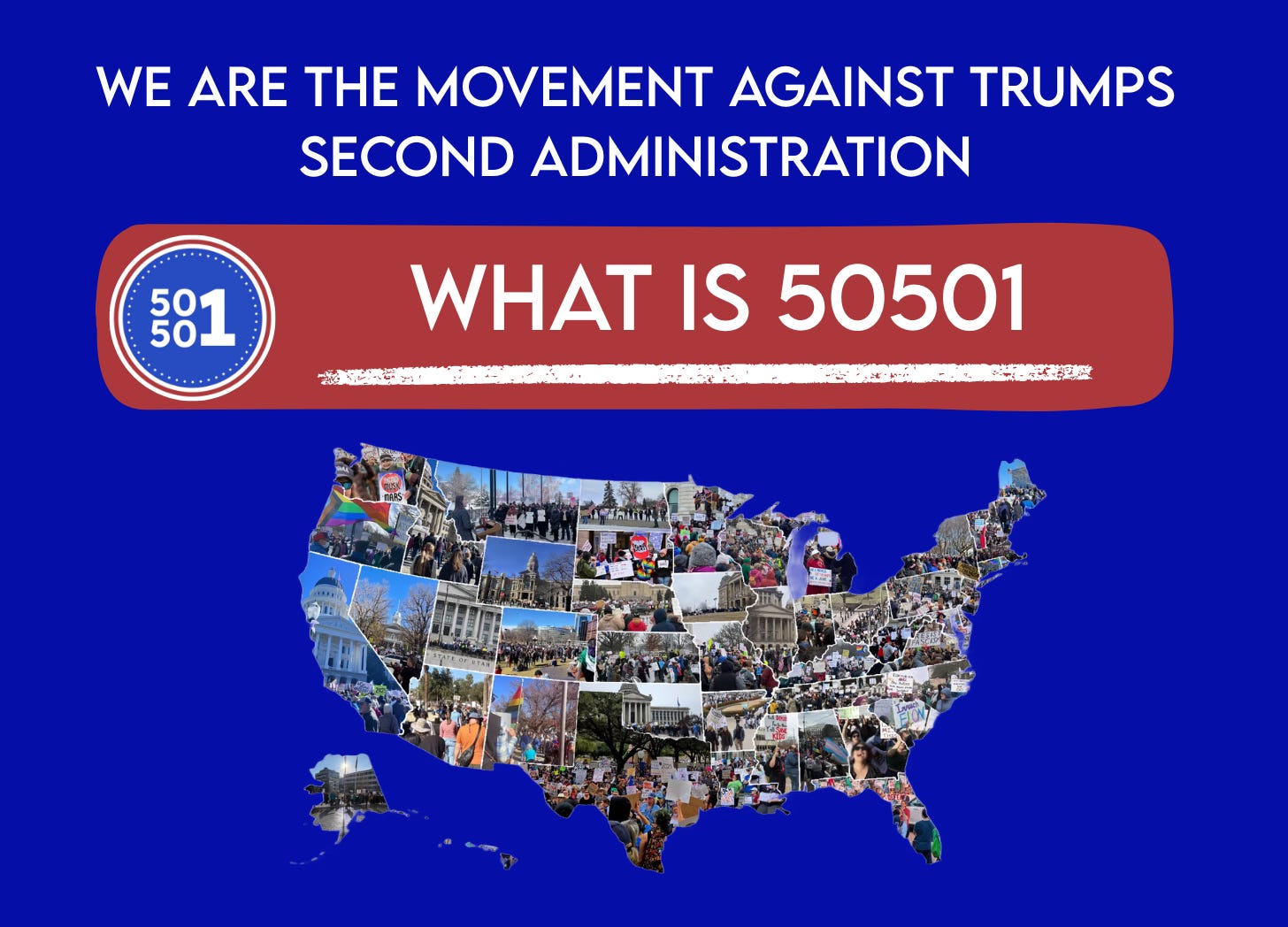 50501 means 50 states, 50 protests, 1 movement, a decentralized, volunteer-powered model built for resilience, where we create collective pressure to demand a better future for this country by defending the constitution and ending executive overreach.