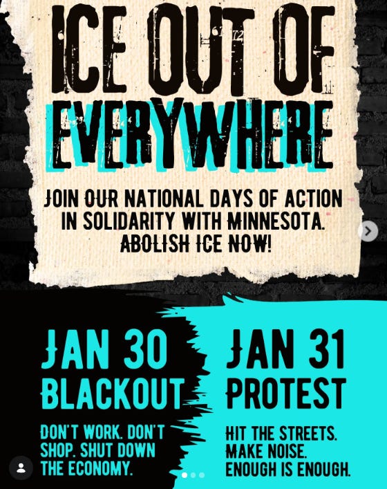 On 1/30 we are shutting it down, and, on 1/31, we are gathering across the country to demand ICE Out of Everywhere, permanently!